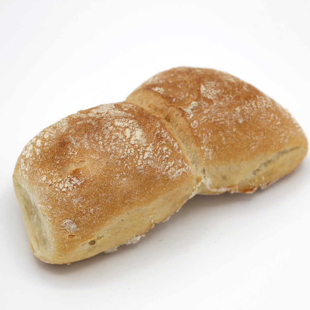 Rustikales Weizenbrötchen. Zwei Stück entsprechen einem Paar. Zutaten: Weizenmehl, Wasser, Malz, Meersalz, Hefe